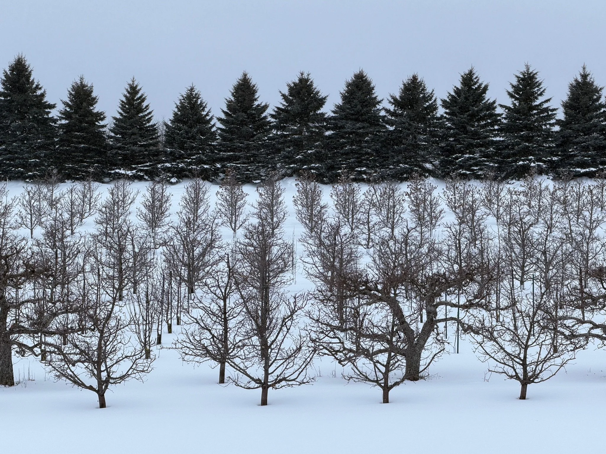 Yesterday I walked through the orchard under a sky the color of pewter, the kind of February sky that feels low enough to touch. Snow lay in clean, unbroken drifts between the rows, and the cold was the kind that settles into your bones—honest and unyielding. The trees stood motionless, their branches etched sharply against the winter light. Everything appeared still, almost suspended, as if time itself had slowed to match the season.